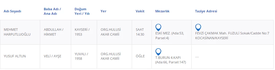 Kayseri Büyükşehir Belediyesi'nden alınan bilgilere göre, vefat eden vatandaşlarımızın bilgileri şu şekilde: