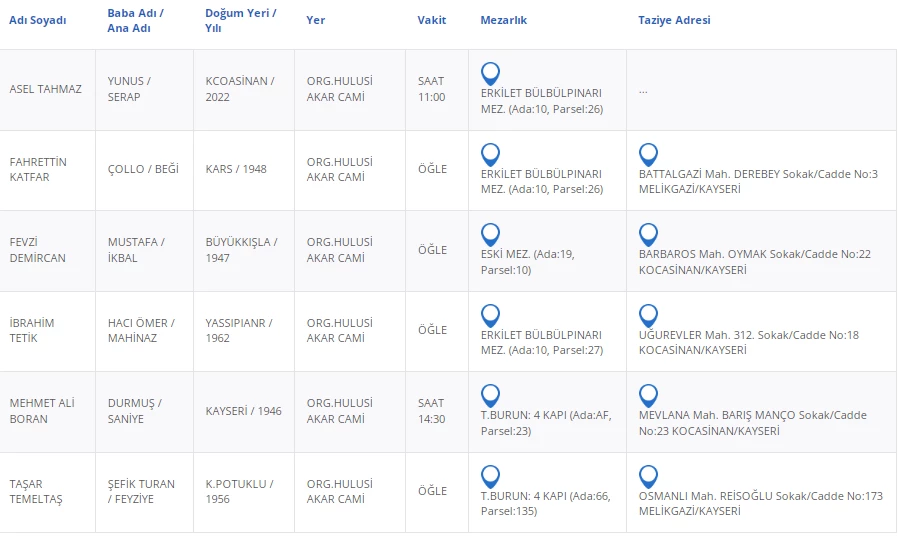 Kayseri Büyükşehir Belediyesinden alınan bilgilere göre vefat eden vatandaşlarımızın bilgileri şu şekilde: