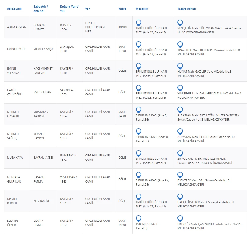 Kayseri Büyükşehir Belediyesi'nden alınan bilgilere göre, vefat eden vatandaşlarımızın bilgileri şu şekilde: