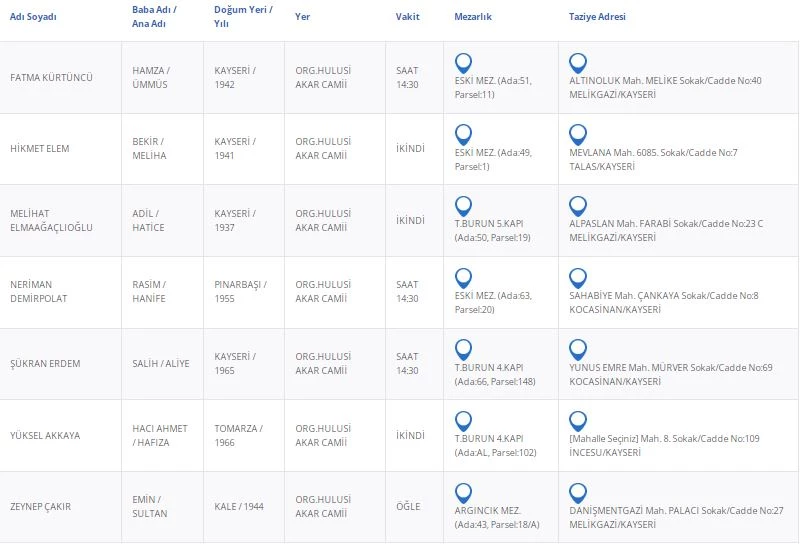 Kayseri Büyükşehir Belediyesi'nden alınan bilgilere göre, vefat eden vatandaşlarımızın bilgileri şu şekilde: