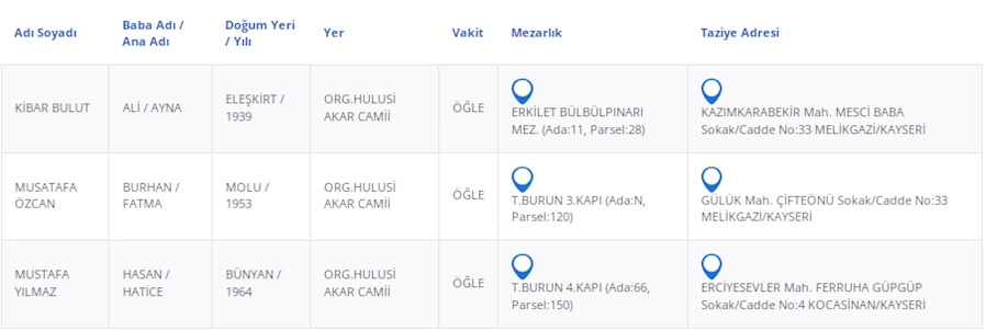 Kayseri Büyükşehir Belediyesi'nden alınan bilgilere göre, vefat eden vatandaşlarımızın bilgileri şu şekilde: