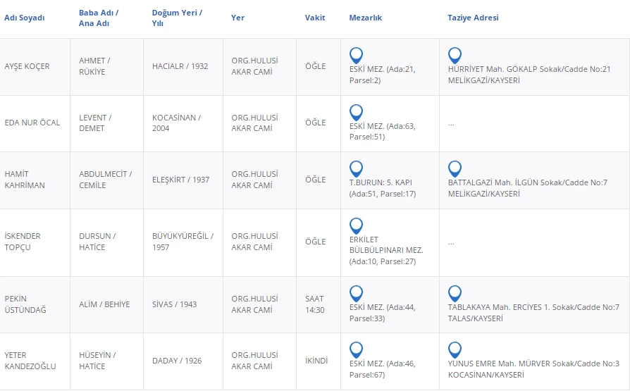Kayseri Büyükşehir Belediyesinden alınan bilgilere göre vefat eden vatandaşlarımızın bilgileri şu şekilde: