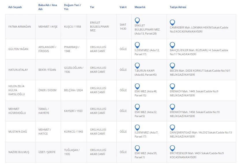 Kayseri’de bugün vefat edenler (18 Temmuz)