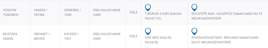 Kayseri Büyükşehir Belediyesinden alınan bilgilere göre vefat eden vatandaşlarımızın bilgileri şu şekilde: