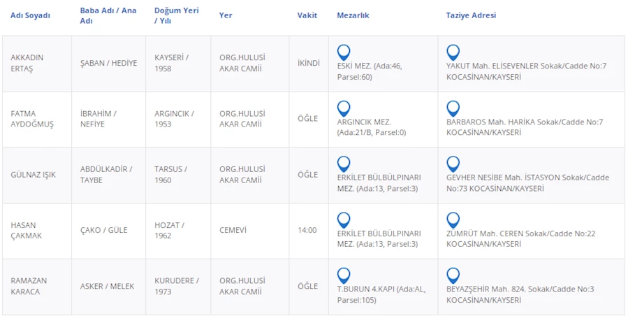 Kayseri Büyükşehir Belediyesi'nden alınan bilgilere göre, vefat eden vatandaşlarımızın bilgileri şu şekilde: