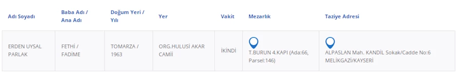 Kayseri Büyükşehir Belediyesi'nden alınan bilgilere göre, vefat eden vatandaşlarımızın bilgileri şu şekilde: