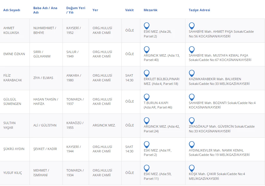 Kayseri Büyükşehir Belediyesi'nden alınan bilgilere göre, vefat eden vatandaşlarımızın bilgileri şu şekilde: