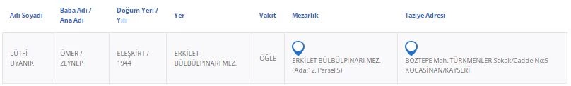 Kayseri Büyükşehir Belediyesi'nden alınan bilgilere göre, vefat eden vatandaşlarımızın bilgileri şu şekilde: