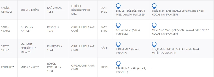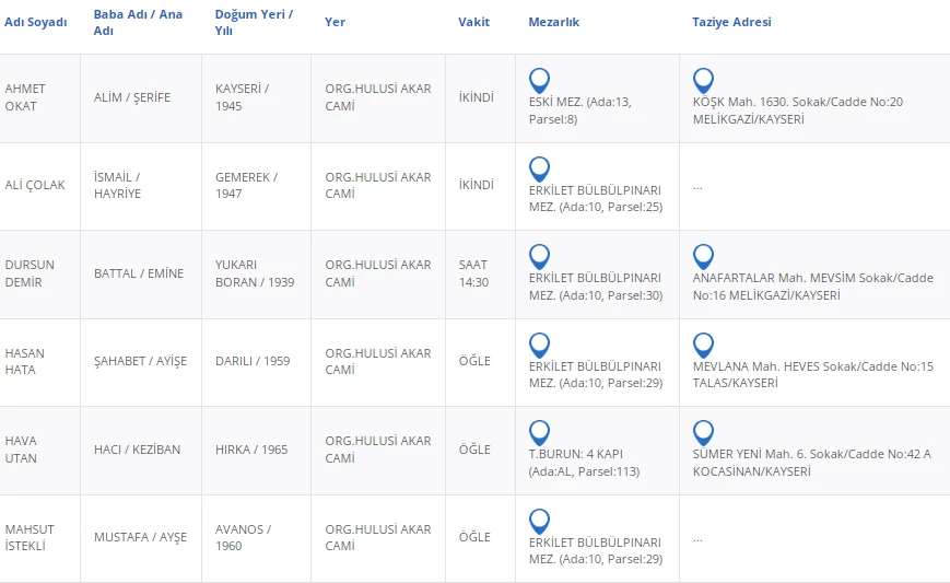 Kayseri Büyükşehir Belediyesinden alınan bilgilere göre, vefat eden vatandaşlarımızın bilgileri şu şekilde: