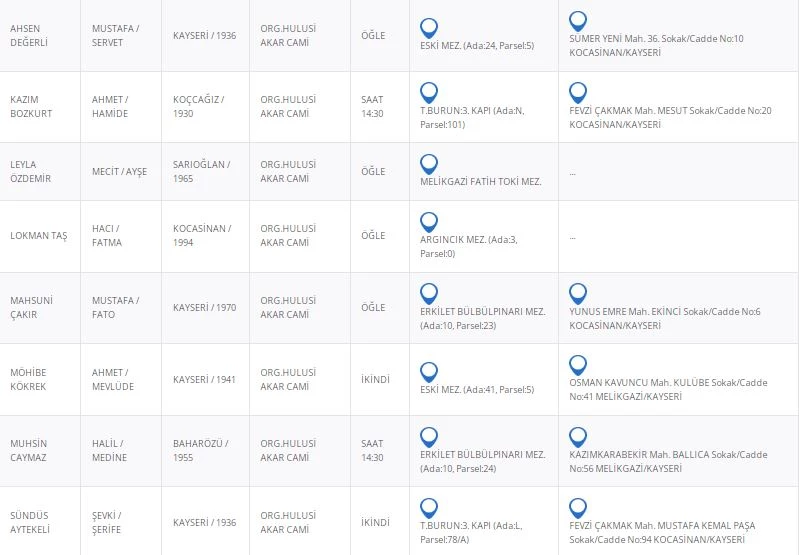 Kayseri Büyükşehir Belediyesinden alınan bilgilere göre vefat eden vatandaşlarımızın bilgileri şu şekilde: