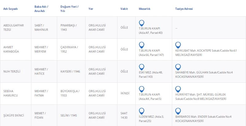 Kayseri Büyükşehir Belediyesi'nden alınan bilgilere göre, vefat eden vatandaşlarımızın bilgileri şu şekilde: