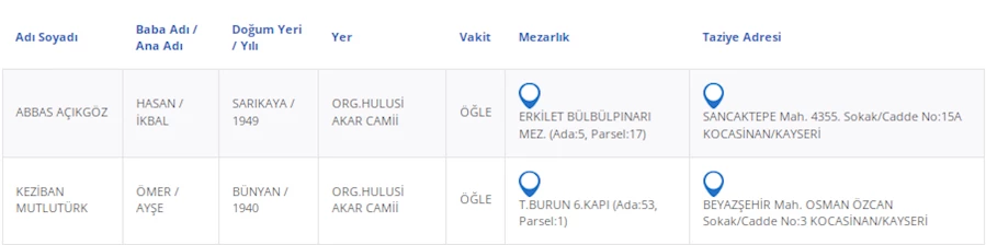 Kayseri Büyükşehir Belediyesi'nden alınan bilgilere göre, vefat eden vatandaşlarımızın bilgileri şu şekilde: