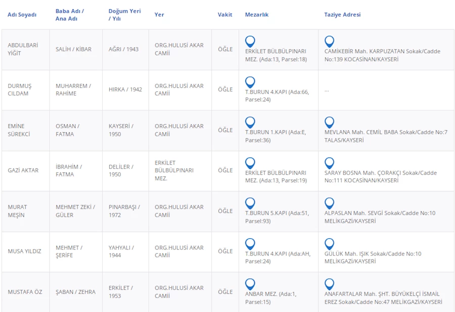 Kayseri’de bugün vefat edenler (31 Mayıs)