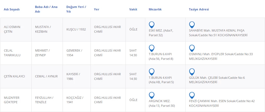 Kayseri Büyükşehir Belediyesi'nden alınan bilgilere göre, vefat eden vatandaşlarımızın bilgileri şu şekilde: