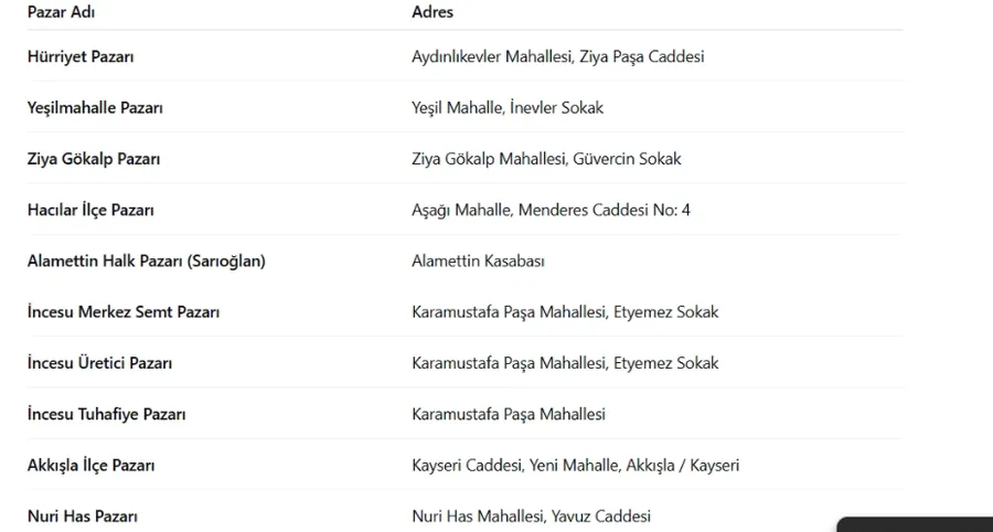 Kayseri’de bugün kurulan pazar yerleri