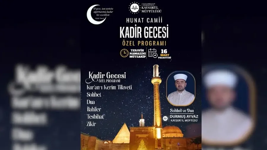 Kayseri İl Müftülüğü, Kadir Gecesi dolayısıyla Hunat Camii’nde Kur’an tilaveti, ilahiler, sohbet ve duaların yer alacağı özel bir program düzenleyecek. Program teravih namazının ardından başlayacak. Detaylar Kayseri Haber'de...