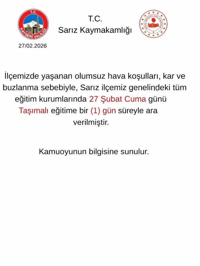 Sarız Kaymakamlığı tarafından yapılan yazılı açıklamada, ilçede etkili olan kar yağışı ve buzlanma nedeniyle 27 Şubat Cuma günü Sarız genelindeki tüm eğitim kurumlarında taşımalı eğitimin durdurulduğu bildirildi.