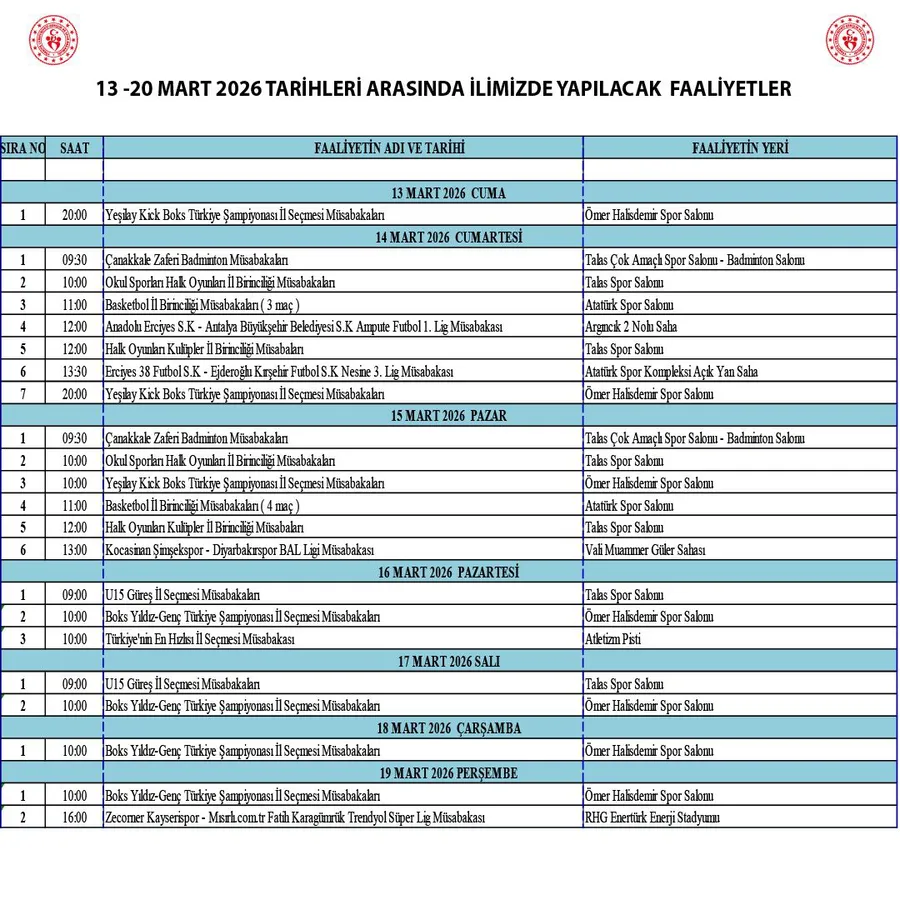 Kayseri’de 13-20 Mart 2026 tarihleri arasında gerçekleştirilecek spor faaliyetleri açıklandı. Program kapsamında kent genelinde farklı branşlarda çok sayıda müsabaka düzenlenecek.