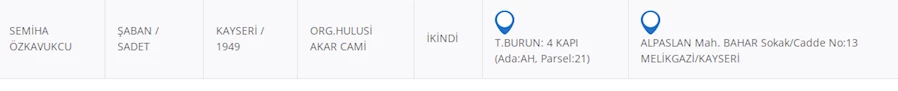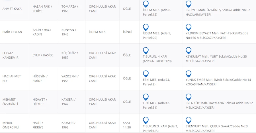 Kayseri Büyükşehir Belediyesinden alınan bilgilere göre vefat eden vatandaşlarımızın bilgileri şu şekilde: