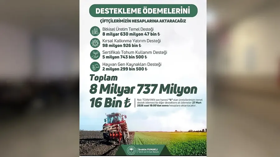Toplamda 8 milyar 737 milyon 16 bin TL destek ödemesi yapılacak. Bakanlık açıklamasında T.C. kimlik numarasının son hanesi 4 olan üreticilerin temel destek ödemesi ve diğer destek ödemelerinin 27 Mart 2026 saat 18:00’dan sonra hesaplarına aktarılacağı belirtildi. Yapılan destek ödemelerinin üreticilerin üretim faaliyetlerini sürdürebilmeleri ve tarımsal yatırımlarını güçlendirebilmeleri açısından önemli olduğu vurgulandı.