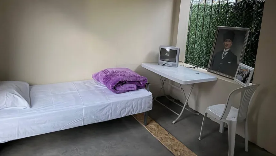 Paylaşılan fotoğraflarda, tek kişilik yatağın bulunduğu sade bir oda yer alıyor. Odada katlanabilir bir masa, plastik sandalye ve küçük bir televizyon bulunuyor. Masanın üzerinde çerçeveli fotoğraflar yer alırken, büyük çerçevede Mustafa Kemal Atatürk’ün portresi dikkat çekiyor. Pencere kısmında demir parmaklıkların bulunduğu odanın oldukça sade şekilde düzenlendiği görülüyor.