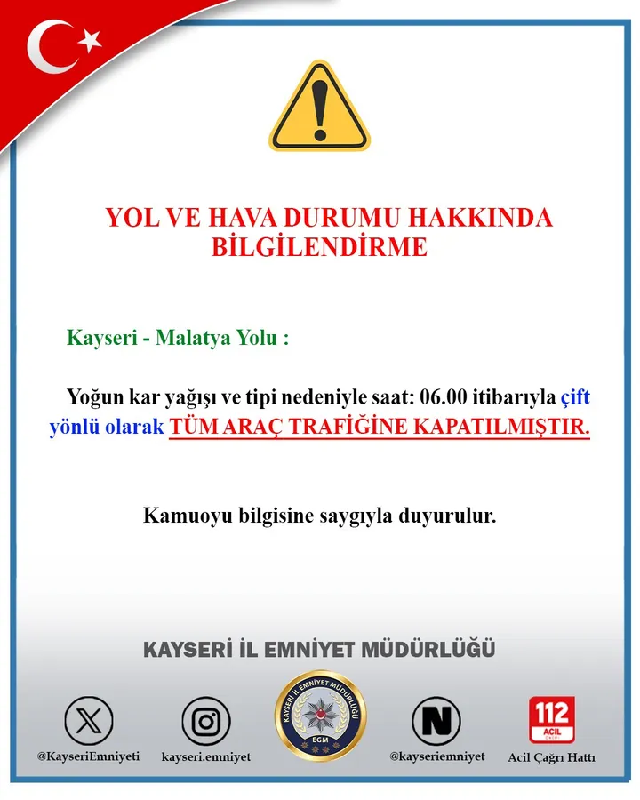 Kayseri İl Emniyet Müdürlüğü, olumsuz hava koşulları nedeniyle Kayseri–Malatya yolunun ulaşıma kapatıldığını duyurdu.