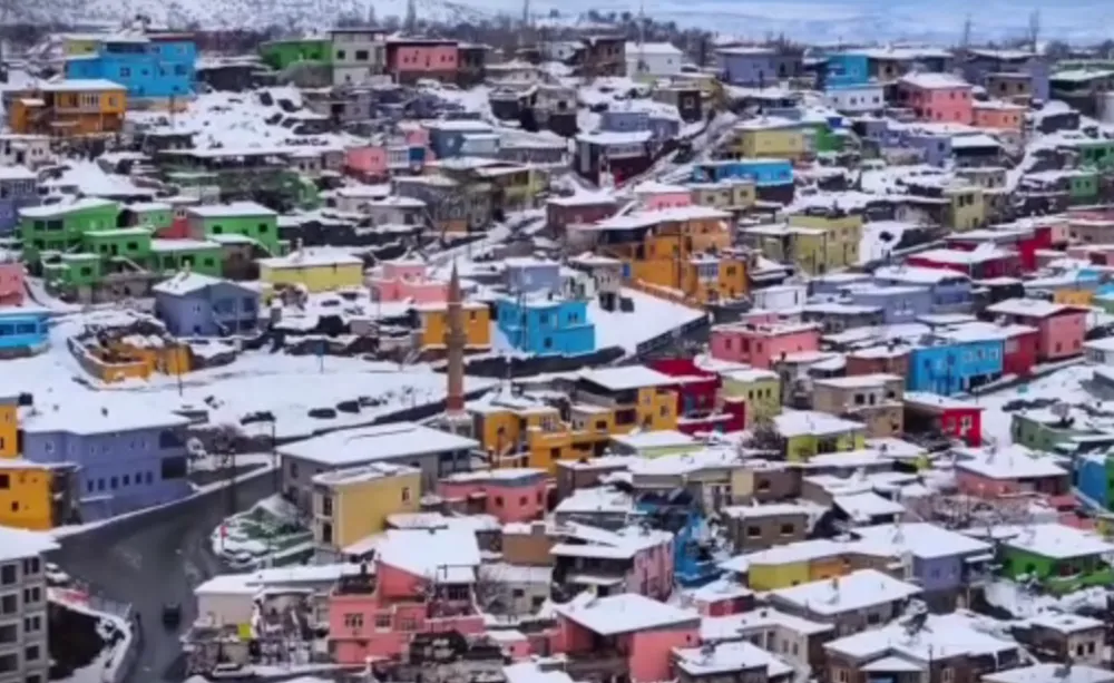 Sarı, kırmızı, yeşil, mavi, kahverengi, turuncu, pembe ve mor gibi renklerin kar beyazıyla iç içe geçmesi, dronla görüntülendi.