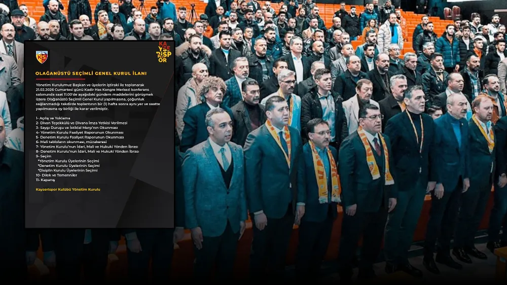 Kayserispor Kulübü Yönetim Kurulu, olağanüstü seçimli genel kurul yapılması yönünde karar aldı. Kulüpten yapılan resmi duyuruya göre, genel kurul 21 Şubat 2026 Cumartesi günü saat 11.00’de Kadir Has Kongre Merkezi Konferans Salonu’nda gerçekleştirilecek.
