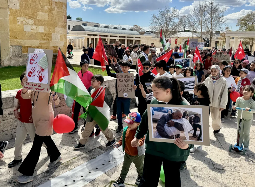 Kırşehir Kudüs Platformu öncülüğünde Ahi Evran Külliyesi önünde başlayan yürüyüşte, çocuklar Türk ve Filistin bayrakları ile dövizler taşıdı.