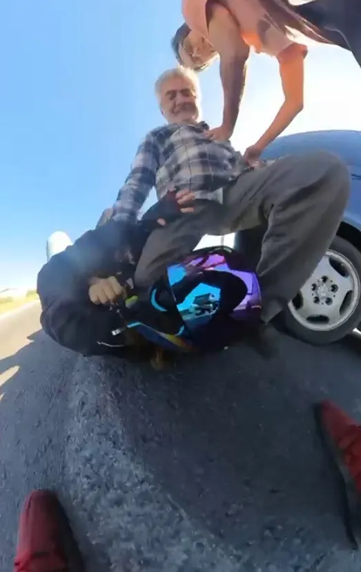 Tartışmanın büyümesi üzerine araçtan inen sürücü M.D. (64), kadın motosiklet sürücüsünü darbetti.