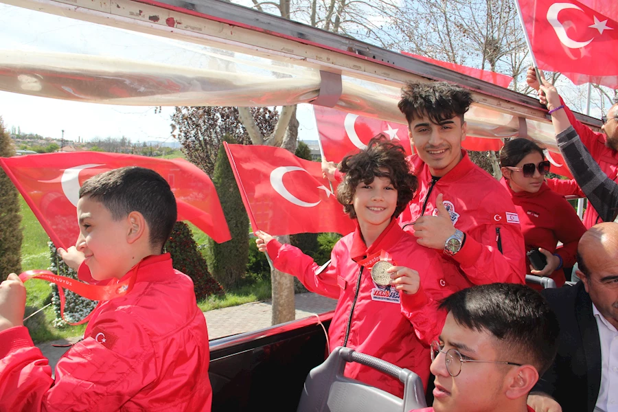 Türk bayrağı ve güllerle karşılanan takıma, Talas Belediyesi'ne ait çift katlı üstü açık otobüsle şehir turu yaptırıldı.