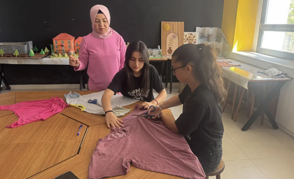 Öğrenciler de atölye çalışmalarında eski tişörtlerden dönüştürdükleri çantayı kullanıyor, atık meyve kabuklarından elde ettikleri sıvı kompostla da okul bahçesindeki ağaçları ve okul içindeki bitkileri suluyor.