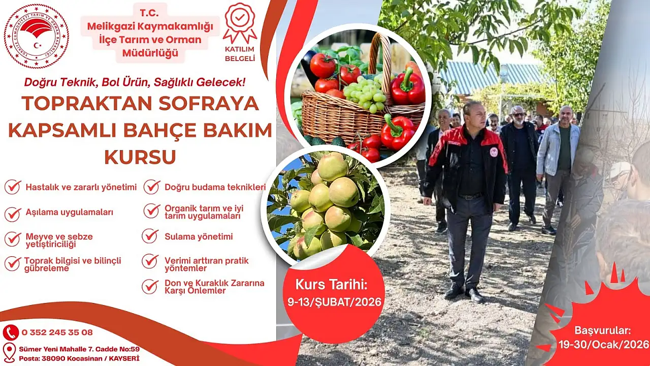 Melikgazi İlçe Tarım ve Orman Müdürlüğü, modern tarımın tüm şifrelerini çözmek ve üreticileri geleceğin tarım teknikleriyle donatmak amacıyla eğitim hamlesi başlatıyor. ‘’Topraktan Sofraya Kapsamlı Bahçe Bakım Kursu'' ismiyle düzenlenen bu program, daha bereketli bir hasat dönemi için profesyonel bir rehberlik hizmeti sunuyor. Teoriden uygulamaya kurs programı, bir üreticinin veya hobi bahçesi sahibinin karşılaşabileceği tüm zorluklara çözüm sunacak şekilde tasarlandı.