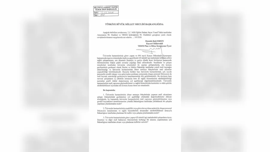 MHP Kayseri Milletvekili Mustafa Baki Ersoy, üniversite hastanelerinde görev yapan 4/D statüsündeki sağlık çalışanlarının yaşadığı ikramiye ve mali hak ödemeleri ile personel eksikliği sorununu Türkiye Büyük Millet Meclisi (TBMM) gündemine taşıdı.