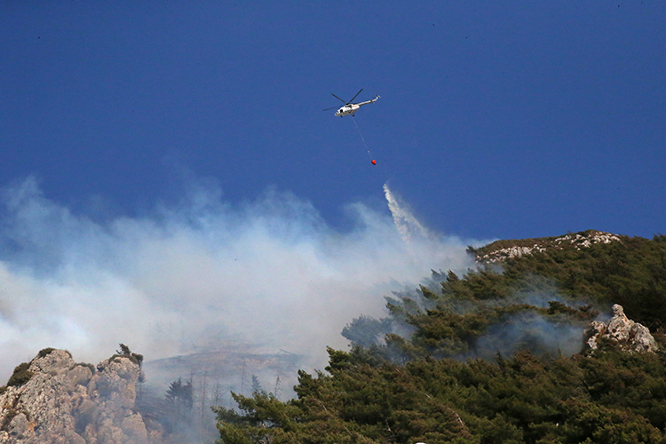 İhbar üzerine olay yerine Orman Bölge Müdürlüğü ile Büyükşehir Belediyesi itfaiye ekipleri, söndürme helikopteri ve arazözler sevk edildi.