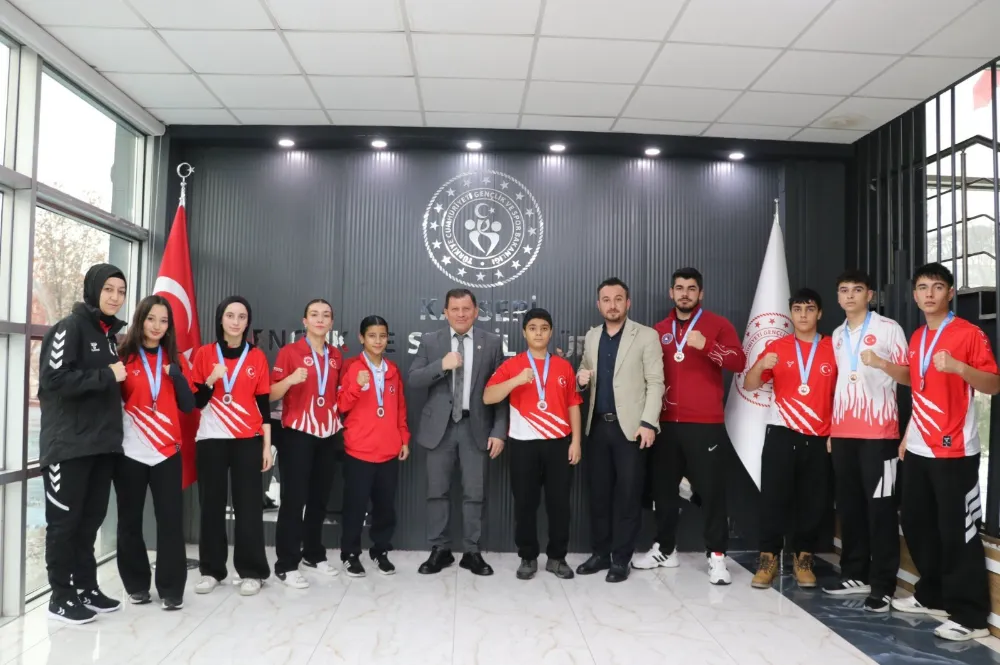 Yalova’da Wushu Türkiye Şampiyonası düzenlendi. Şampiyonada Sağlık Erva Spor Kulübü sporcuları 3 altın, 2 gümüş ve 3 bronz olmak üzere 8 madalya kazandı. Şampiyona dönüşünde sporcular; Erva Spor Okulları Şube Müdürü Muammer Benli ve antrenörleriyle birlikte Gençlik ve Spor İl Müdürü Ali İhsan Kabakcı’yı makamında ziyaret etti. Ziyaretten duyduğu memnuniyeti dile getiren İl Müdürü Kabakcı, sporcuları ve antrenörleri Nurten Kurt’u tebrik ederek, 20-22 Ocak 2026 tarihleri arasında gerçekleştirilecek Wushu Milli Takım Seçmelerinde başarılar diledi.