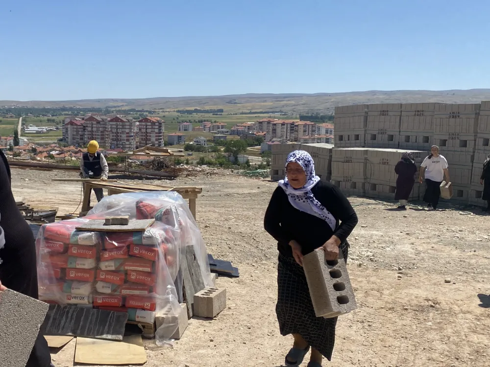Mahalleli kadınlar, duvar ören ustalara yardımcı olmak amacıyla inşaat alanına briket taşıyor. Genci, yaşlısı herkesin katkı sunduğu inşaat, imece usulüyle ilerliyor.