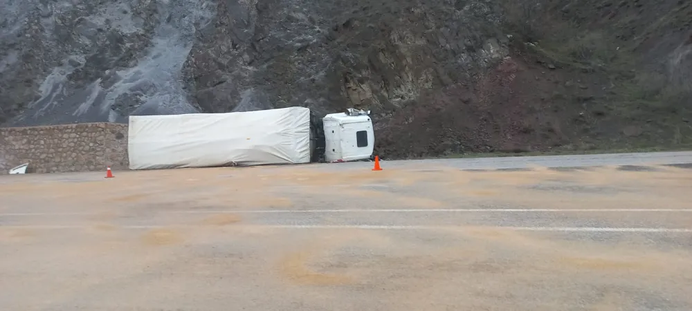 C.A. (24) idaresindeki 27 ACL 589 plakalı kamyon, Suşehri ilçesi Geminbeli geçidi Kekeç köyü yakınlarında sağanak yağış nedeniyle kayganlaşan yolda devrildi.