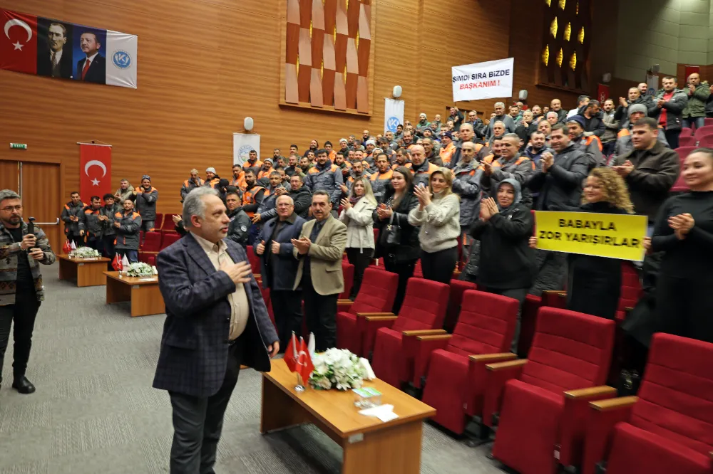 Başkan yardımcıları ve birim müdürlerinin de katıldığı programda Başkan Yalçın, salona belediye çalışanlarının alkışları ve sloganları eşliğinde girdi. Salonda birlik, beraberlik ve dayanışma mesajları ön plana çıktı.