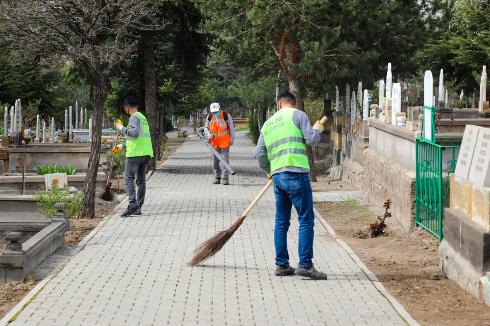 Bayram öncesi çalışmalarını hızlandıran Talas Belediyesi, başta camiler ve mezarlıklar olmak üzere ilçe genelindeki genel temizlik ve çevre düzenlemesi yaparak ilçeyi bayrama hazır hale getirdi.