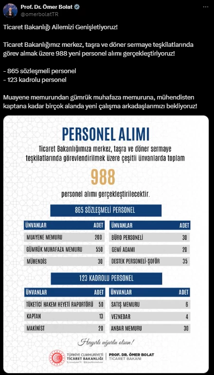 Ticaret Bakanlığı ailesini genişlettiklerini belirten Bolat, merkez, taşra ve döner sermaye teşkilatlarında görevlendirmek üzere 988 yeni personel alımı gerçekleştireceklerini vurguladı.