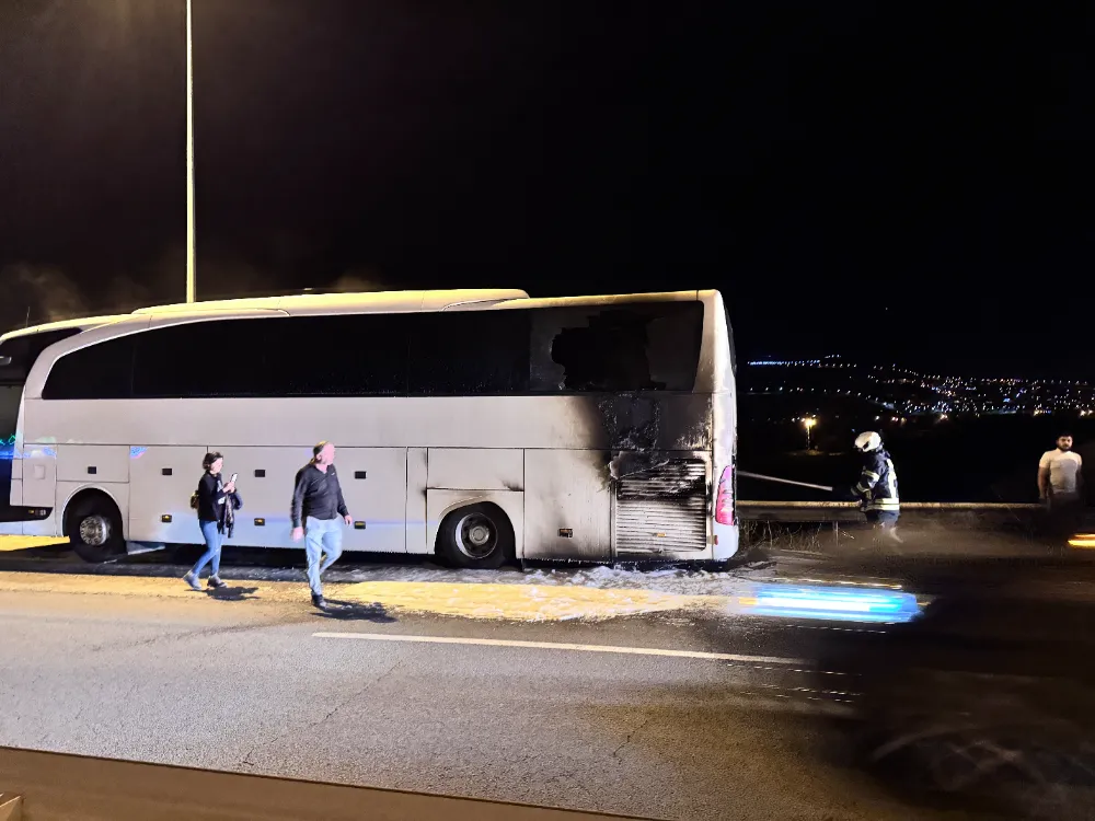 Otobüs şoförü alevleri fark edince aracı emniyet şeridine çekerek yolcuları tahliye etti.