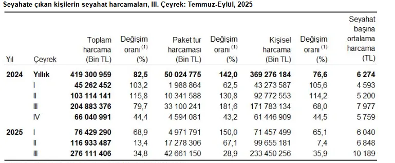Yerli turistlerin, yurt içinde yaptıkları seyahat harcamaları 2025 yılının III. çeyreğinde bir önceki yılın aynı çeyreğine göre %34,8 artarak 276 milyar 111 milyon 406 bin TL olarak gerçekleşti. Bu harcamaların %84,5'ini 233 milyar 450 milyon 256 bin TL ile kişisel harcamalar, %15,5'ini ise 42 milyar 661 milyon 150 bin TL ile paket tur harcamaları oluşturdu. Seyahat başına yapılan ortalama harcama ise 10 bin 189 TL oldu.