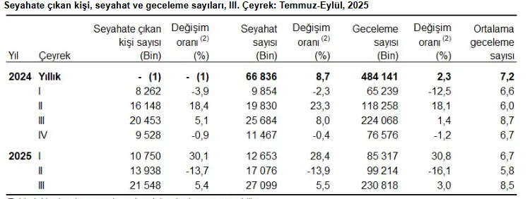 Türkiye İstatistik Kurumunun 2025 yılının Temmuz, Ağustos ve Eylül aylarından oluşan III. çeyrekteki verilerine göre, yurt içinde ikamet eden 21 milyon 548 bin kişi seyahate çıktı. Seyahate çıkanların bir ve daha fazla geceleme kaydı ile ülke içinde yaptıkları toplam seyahat sayısı bir önceki yılın aynı çeyreğine göre %5,5 artarak 27 milyon 99 bin seyahat olarak gerçekleşti. Bu çeyrekte seyahate çıkanlar 230 milyon 818 bin geceleme yaptı. Ortalama geceleme sayısı 8,5 gece oldu.
