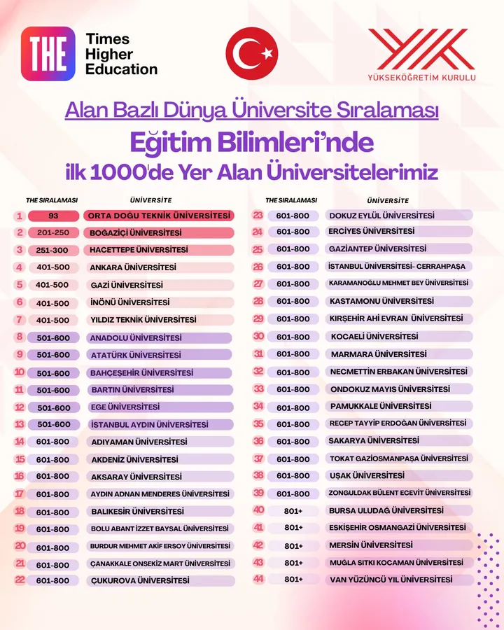 Eğitim Bilimleri alanında dünyanın en iyi 100 üniversitesi arasına giren Orta Doğu Teknik Üniversitesi (93. sıra) dikkat çekerken; Boğaziçi Üniversitesi (201–250), Hacettepe Üniversitesi (251–300) ile Ankara, Gazi, İnönü ve Yıldız Teknik üniversitelerinin (401–500) elde ettiği dereceler Türkiye’nin alandaki akademik gücünü gözler önüne serdi.