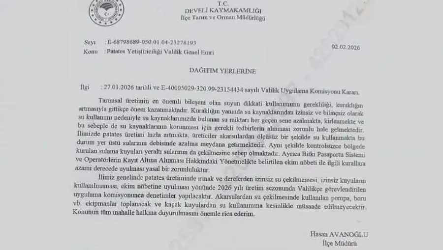 Resmi yazıda özellikle patates üretimindeki hızlı artışa dikkat çekiliyor. Ölçüsüz sulamanın akarsuların debisini düşürdüğü, kontrolsüz kuyuların ise yeraltı su seviyelerini zorladığı ifade edilirken, denetimlerin önümüzdeki üretim sezonunda daha yoğun şekilde uygulanacağı bildiriliyor.