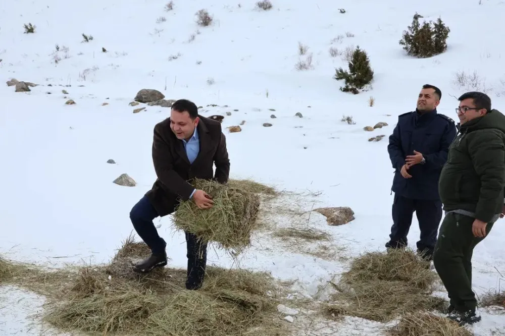 Yahyalı Aladağlar bölgesinde yapılan çalışma kapsamında, yaban hayvanlarının kış aylarında beslenme sıkıntısı yaşamaması için doğaya ot ve yem bırakıldı.