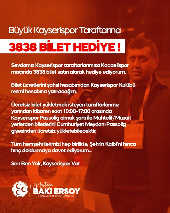 Milliyetçi Hareket Partisi Kayseri Milletvekili Baki Ersoy, Kayserispor taraftarını sevindiren bir adımı daha hayata geçirdi. Daha önce de birçok karşılaşma öncesi taraftarlara bilet desteği sağlayan Ersoy, bu kez Kayserispor’un Kocaelispor ile oynayacağı maç için 3 bin 838 bileti taraftarlara hediye edeceğini duyurdu.