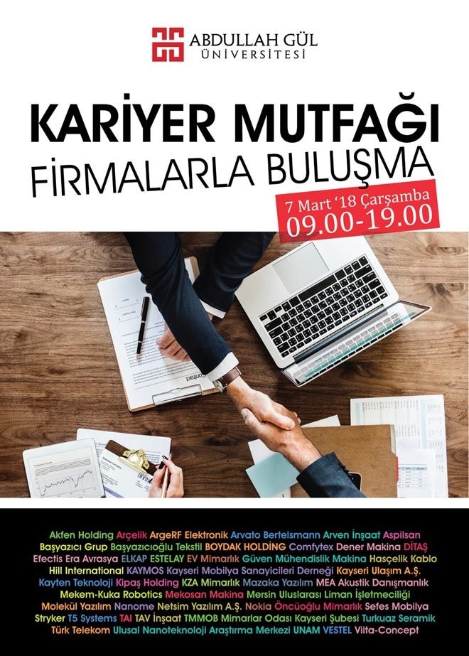 Bu yıl ilk kez mezun verecek olan Abdullah Gül Üniversitesi (AGÜ), mezun olacak öğrencilerini firmalarla buluşturarak onların hem iş bulabilme hem de staj için firma bulabilmelerine imkan sağlayacak.
