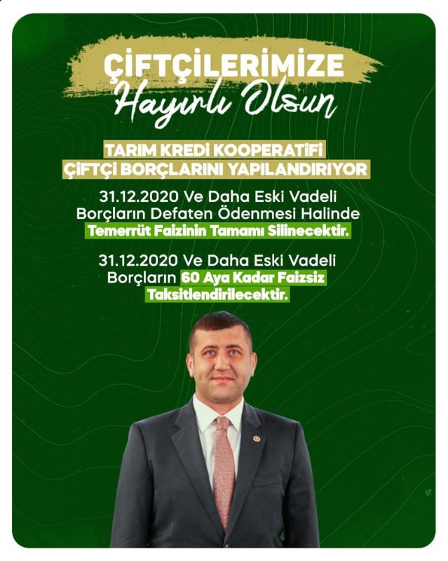 MHP Kayseri Milletvekili Baki ERSOY, sosyal medyasından çiftçilere müjdeyi verdi. Tarım Kredi Kooperatiflerinin çiftçilerin borçlarını yapılandırdığını duyurdu. Ersoy paylaşımında şu ifadelere yer verdi;